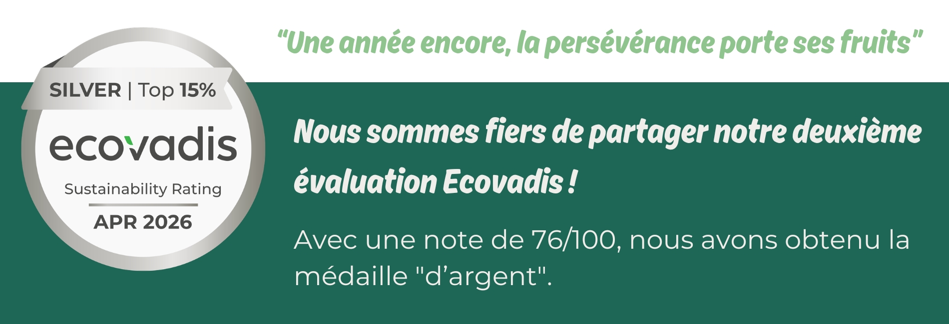 Nous sommes fiers d’annoncer l’obtention de la médaille d’argent EcoVadis 2026, avec un score de 76/100. Cette distinction récompense la solidité de notre démarche en matière de Responsabilité Sociétale des Entreprises (RSE) et témoigne de notre engagement en faveur d’un développement durable et responsable.